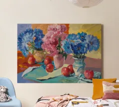 Un'audace natura morta con vivaci fiori rosso-rosa, forse papaveri o gerani, in un semplice vaso, accanto a fresche pere verdi, il tutto su una ricca tovaglia rossa che contrasta nettamente con uno sfondo blu intenso.