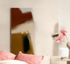 Opera d'arte astratta minimalista con una tavolozza di colori serena ed elegante: le morbide tonalità pastello come il verde turchese chiaro e il beige creano un'atmosfera rilassante, mentre il contrasto con il grigio scuro e l'arancione brillante aggiunge profondità e vivacità. Questa combinazione offre un'estetica minimalista e astratta con un tocco di raffinatezza. È un equilibrio di calma e interesse visivo, perfetto per creare uno spazio tranquillo ma visivamente accattivante.