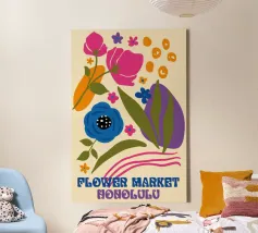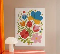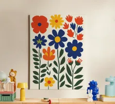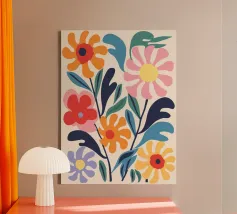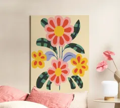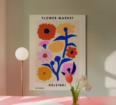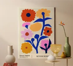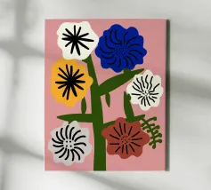 Questo vivace disegno floreale combina colori vivaci e forme moderne: Fiori rossi e blu con un centro giallo solare su un allegro sfondo rosa e giallo. Un motivo fresco ed elegante che unisce il fascino retrò degli anni '70 alla chiarezza scandinava. Perfetto come murale, tazza, cuscino o cover per cellulare, per gli amanti dei motivi floreali colorati, delle decorazioni di metà secolo e degli accessori moderni per la casa. Un richiamo ideale per il soggiorno, la camera da letto o l'ufficio e un regalo affascinante per gli amanti dell'arte e dei fiori.