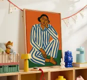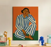 Una donna siede pensierosa in una posa rilassata, indossando un pigiama a righe bianche e blu. La donna è collocata su uno sfondo arancione caldo, che crea un forte contrasto cromatico.