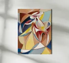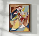 The painting features a vibrant and dynamic composition of abstract shapes and colors. The use of bold lines and a mix of primary colors, such as red, yellow, and blue, creates a sense of movement and energy. The forms appear to be in a harmonious dance, blending and intersecting with each other.