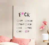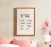 Un pezzo tipografico sfacciato e motivazionale per le giornate "da fare". Il titolo censurato "F*ck" si trova sopra le caselle di controllo disegnate a mano "OFF, THAT, ME, NO, YEAH, YOU, THIS" con un segno di spunta rosa acceso. Perfetto per uffici, studi, dormitori o pareti di gallerie; un regalo divertente per gli amici con senso dell'umorismo.