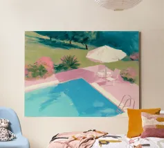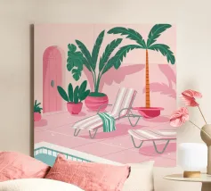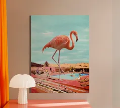 Una scena nostalgica di Palm Springs: un fenicottero rosa che nuota alla deriva in una piscina turchese, incorniciata da morbidi lettini pastello e palme svettanti. Quest'opera d'arte conferisce uno spirito estivo retrò, un'atmosfera vacanziera rilassata e un fascino di metà secolo a qualsiasi parete, ideale per soggiorni, camere da letto o per un arredamento elegante a bordo piscina.