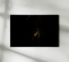 Da un vuoto più denso della mezzanotte emerge una singola esca gialla, la cui calda goccia di luce fa vorticare il plancton in orbite ipnotiche. Solo le più deboli nervature di una rana pescatrice in agguato si registrano sul bordo della tela, ricordandoci che ogni promessa di luminosità porta con sé un intento nascosto. La texture granulosa riproduce il modo in cui la materia particolata disperde i fotoni sott'acqua, mentre il nero circostante assorbe il pensiero e lo sguardo. È un momento di tensione tra curiosità e cautela, catturato in una scintilla tremante e senza tempo.