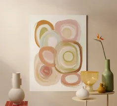 Un dipinto astratto caratterizzato da forme circolari sovrapposte e texture delicate. La tavolozza di colori caldi aggiunge profondità e morbidezza, rendendolo un raffinato punto focale per gli spazi moderni.