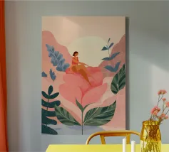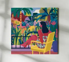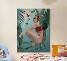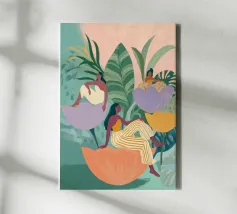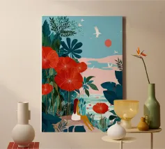 Tra imponenti papaveri corallini e palme piumate, una donna si sdraia pacificamente sotto un audace sole rosso, galleggiando su una pozza di quiete. Uccelli bianchi si librano in un cielo da sogno, facendo eco all'immobilità della sua posa. La scena, sullo sfondo di ricche montagne indaco e di un cielo color mandarino, cattura un'armonia surreale tra la natura e il sé, un momento sospeso in cui il tempo fiorisce e il pensiero si dissolve nel colore e nella calma.