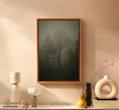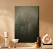 Foresta nebbiosa con pini e alberi spogli tela con Cornice a cassetta