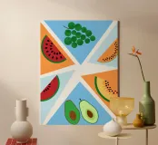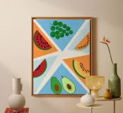 con vari frutti freschi come anguria, melone, uva e avocado in forme geometriche.