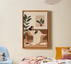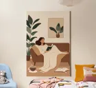 A minimalist digital painting of a woman reclining on a sofa with a book in hand. Surrounded by lush indoor plants and a steaming cup of coffee, the scene captures the essence of self-care and slow evenings at home. Perfect for modern and cozy interiors alike.