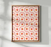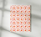 Ghiande grafiche rosa e rosse accoppiate a linee ondulate di piastrelle truchet su uno sfondo crema chiaro.