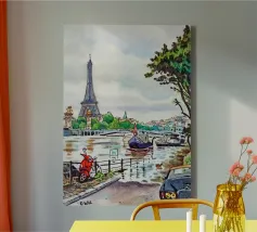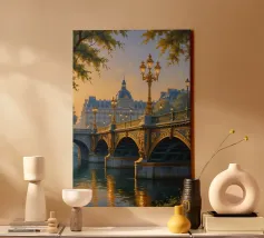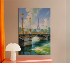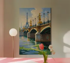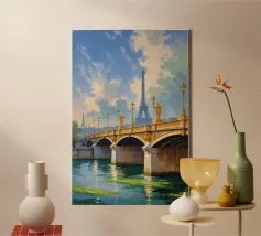 Un magnifico dipinto impressionista che mostra la Torre Eiffel sullo sfondo, incorniciata dall'ornato ponte dorato che attraversa la Senna. Le calme acque sottostanti riflettono gli intricati dettagli dei lampioni e delle sculture dorate. Il cielo azzurro, punteggiato da soffici nuvole, crea un'atmosfera parigina serena e incantevole. La luce dorata esalta il fascino senza tempo del ponte, fondendosi magnificamente con la silhouette iconica della Torre Eiffel. Una celebrazione dell'eleganza architettonica e della bellezza naturale.
