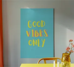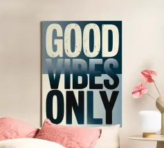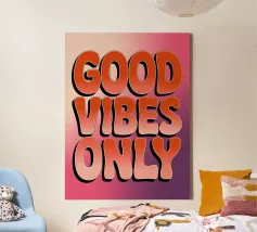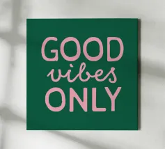 Un messaggio luminoso ed edificante per una casa felice. Questa scritta a mano riporta la classica frase "GOOD VIBES ONLY" su un allegro sfondo a righe.