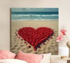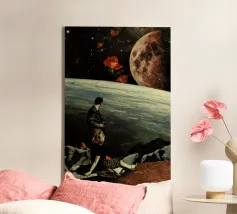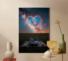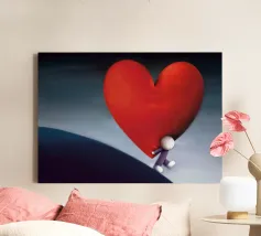 Un cuore colossale e consumato dalle intemperie fluttua serenamente sopra un vasto paesaggio incrinato, simbolo potente di un amore duraturo in un mondo desolato. Due piccole figure si ergono al suo cospetto, aggiungendo la scala epica e l'atmosfera cinematografica di questa opera d'arte surreale. Con i suoi toni vintage e le sue immagini che fanno riflettere, quest'opera è un invito alla conversazione e un tributo al grande viaggio dell'amore.