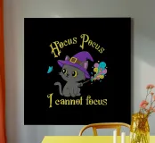 Un gattino nero indossa un cappello da strega e tiene in mano una bacchetta che sprigiona magia colorata. La frase "Hocus Pocus, non riesco a concentrarmi" gioca sulla difficoltà di mantenere l'attenzione, portando umorismo e relatività a chi vive con l'ADHD o si sente costantemente distratto. Ideale per gli appassionati di gatti, magia, Halloween e stampe divertenti con un tocco geek e inclusivo.