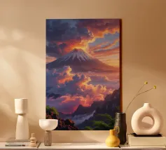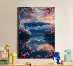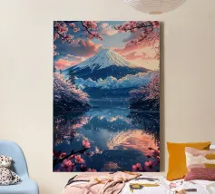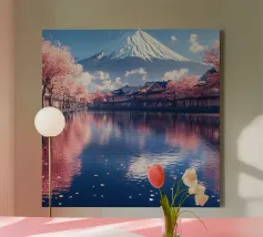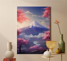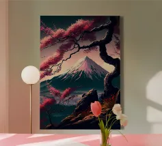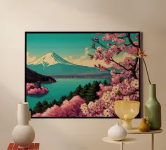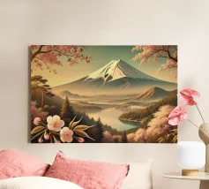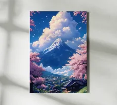 Una vista mozzafiato del maestoso Monte Fuji che si staglia nel cielo limpido di primavera. In primo piano, delicati fiori di ciliegio (sakura) danzano nel vento, conferendo alla scena una poetica leggerezza. La combinazione tra la forza della natura e la bellezza dei fiori simboleggia la transitorietà, l'armonia e il profondo legame tra la cultura giapponese e la natura. Questa immagine cattura perfettamente la magia della stagione della fioritura dei ciliegi, ideale per opere d'arte da parete, calendari o diari di viaggio.