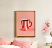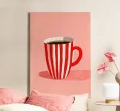 Illustrazione di una tazza di caffè con strisce rosse e bianche su sfondo rosa. Design piatto e minimalista con forme semplici, disegno a mano e texture a guazzo. Stile giocoso di ispirazione vintage, che ricorda le illustrazioni dei libri per bambini e trasmette un'atmosfera allegra ed estetica.