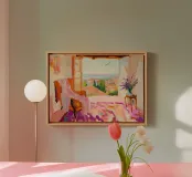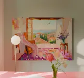 Un dipinto a olio ad Impasto digitale ad alta risoluzione che cattura un momento lussuoso e soleggiato in una stanza che si affaccia sul Mediterraneo. La scena è incorniciata da una porta-finestra aperta, che mostra tetti di terracotta rossa, cipressi e il mare turchese. L'interno è reso con pennellate eccezionalmente spesse ed espressive di pesca, arancione infuocato, viola deciso e rosa fucsia, che conferiscono al pavimento un sorprendente motivo astratto di colore e luce. Un'accogliente poltrona arancione, avvolta in un morbido scialle rosa, si trova accanto a un tavolino con un vaso di lavanda. Questo pezzo è una miscela perfetta di