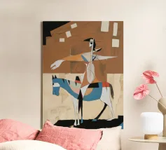 Questo dipinto presenta due figure astratte in una posa intima e ravvicinata. L'uso di forme geometriche e di colori decisi aggiunge profondità e complessità alla scena.