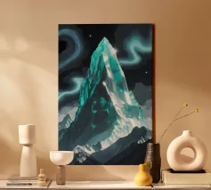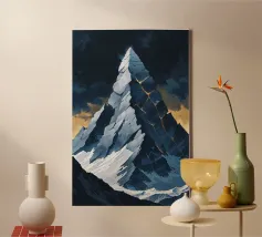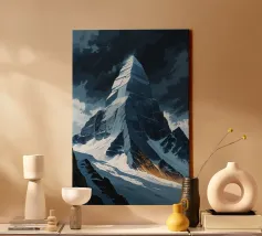 Questa rappresentazione del K2, di grande impatto visivo, utilizza audaci forme angolari che imitano i contorni geometrici di questa vetta imponente. Avvolta da un cielo scuro e tempestoso, la montagna attira l'attenzione con i suoi bordi frastagliati e le sue creste illuminate, creando un drammatico contrasto di luci e ombre. Gli accenti dorati lungo la base dei pendii aggiungono una dimensione suggestiva, simboleggiando un percorso attraverso il caos. Questo approccio artistico trasforma il K2 in un monumento astratto dell'inesorabile potenza e splendore della natura.