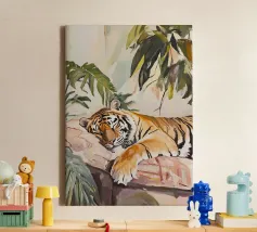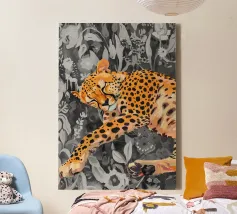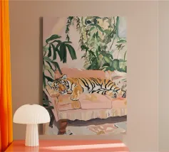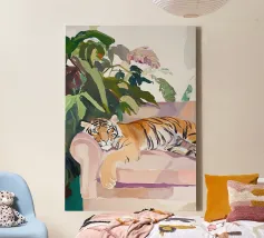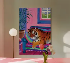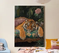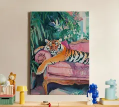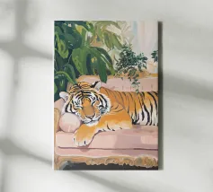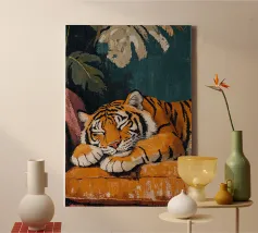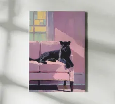 Un'opera d'arte serena e stravagante di un ghepardo che sonnecchia pacificamente su un divano vintage a righe bianche e verdi. I motivi vivaci e la postura accogliente del grosso felino creano un contrasto sognante e spiritoso tra la natura selvaggia e la rilassata vita domestica. Perfetto per gli amanti degli animali, i collezionisti d'arte eclettica e gli appassionati di estetica d'interni giocosa.