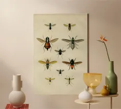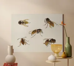 Questo affascinante disegno mostra nove diverse specie di api mellifere del genere Apis su uno sfondo uniformemente disegnato. Ogni ape è graficamente stilizzata ma fedelmente riprodotta ed etichettata con il suo nome scientifico, da Apis mellifera ad Apis dorsata. Al centro è presente un alveare decorativo che completa esteticamente il tema. Ideale per gli amanti della natura, gli apicoltori, gli insegnanti di biologia o come murale educativo nella stanza dei bambini o in classe.