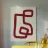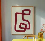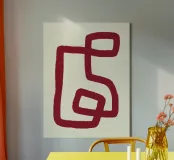 Un'audace linea rossa forma una forma astratta a incastro su uno sfondo color crema. La semplicità e la fluidità contrastano splendidamente con la scelta dei colori.