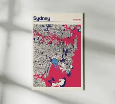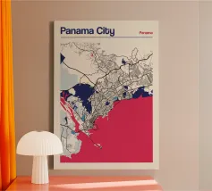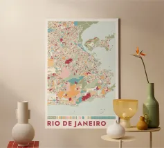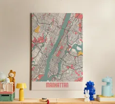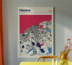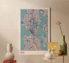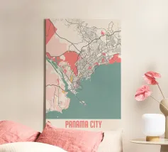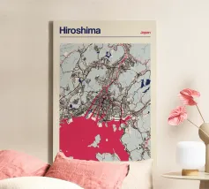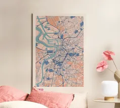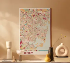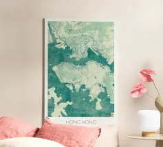 Una mappa artistica di Hong Kong che cattura l'armoniosa combinazione di paesaggio urbano e costa con strutture e colori chiari.