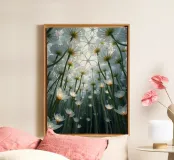 Questo incantevole pezzo cattura una vista mozzafiato, a occhio di verme, di un campo fantastico dove fiori bianchi e traslucidi con delicati petali a ventaglio si protendono verso il cielo. I fiori eterei, che ricordano dente di leone o giglio, sono illuminati dall'interno e proiettano una luce calda e dorata che crea un'atmosfera magica e onirica. Sotto gli steli si intravede un rigoglioso e verdeggiante suolo forestale, che ancorano la scena ultraterrena a un senso di meraviglia naturale. La composizione attira lo sguardo verso l'alto, in direzione di un baldacchino radioso, simile a una stella, che suggerisce una meraviglia celeste o architettonica che funge da sfondo.