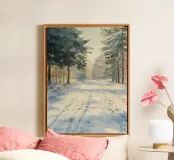 Una tranquilla mattina d'inverno si dispiega in questo dipinto d'atmosfera: un sentiero innevato nella foresta conduce attraverso alti abeti ricoperti di brina. La luce delicata del sole nascente filtra attraverso gli alberi e inonda il paesaggio di un caldo bagliore dorato. Le tracce sulla neve raccontano il movimento nella quiete: natura, pace e luce si combinano per creare un armonioso idillio invernale.