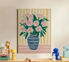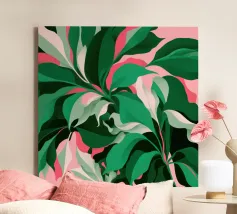 Forme botaniche astratte, tra cui foglie e steli nei toni del rosa, del viola, del blu e del beige, sono disposte su uno sfondo scuro. La composizione è elegante e moderna, incentrata su forme organiche e giochi di colore.