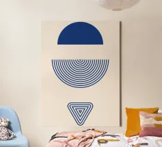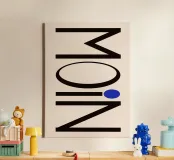Questo moderno design ispirato alla Bauhaus presenta la parola tedesca MOIN scritta verticalmente in lettere nere con un giocoso punto blu sulla i. La sua geometria pulita e la composizione minimalista lo rendono un pezzo perfetto per gli amanti dell'arte murale contemporanea e tipografica. Un'aggiunta ideale a una galleria da parete con toni blu.