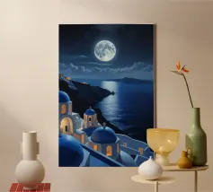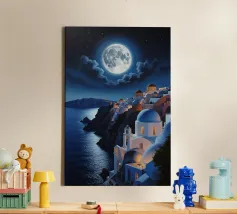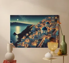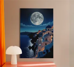 Scoprite il fascino dei sentieri al chiaro di luna di Santorini, che si snodano tra le iconiche strutture imbiancate dell'isola. La luce scintillante della luna piena bagna le scogliere e i sentieri, offrendo un bagliore ultraterreno. Le calde tonalità dorate delle finestre e delle porte illuminate contrastano con il blu profondo del Mar Egeo. Le stelle scintillano in alto, creando un'armonia celestiale con il paesaggio sereno sottostante. Questa scena incarna l'essenza della tranquillità mediterranea e della bellezza senza tempo.