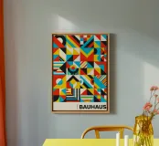 Un poster verticale sorprendente e ad alta energia che presenta un complesso e denso mosaico di forme geometriche interconnesse - triangoli, quadrati, archi e strisce - in una vibrante e classica tavolozza Bauhaus di rosso, giallo, ciano e nero su uno sfondo color crema. Il design è altamente modulare e dinamico e ricorda la pixel art digitale dell'epoca. La tipografia "BAUHAUS", decisa e pulita, è il punto di riferimento del disegno in basso. Questo file digitale di qualità eccezionale (7000x5000 pixel, 300 dpi) garantisce una stampa magnifica per un arredamento murale modernista di alto livello.