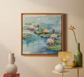 Questo splendido acquerello cattura l'essenza pacifica di uno stagno illuminato dal sole e ornato da delicate ninfee. I fiori bianchi e rosa fluttuano con grazia sull'acqua blu, calma e riflettente, circondati da ampie ninfee verdi. Le delicate pennellate e l'armoniosa miscela di colori evocano un senso di tranquillità e bellezza naturale, rendendolo un pezzo perfetto per chiunque voglia aggiungere un tocco di serenità alla propria casa. Quest'opera d'arte è una celebrazione della semplice eleganza della natura e dei momenti di tranquillità che si possono trovare in uno stagno da giardino.