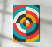Un poster astratto ipnotico che presenta un motivo di cerchi concentrici o "bersagli" di arte ottica (Op Art). Il disegno utilizza un'audace tavolozza di colori di ispirazione retrò, composta da rosso vibrante, verde acqua intenso, giallo solare e carbone, alternati a un bianco sporco e pulito. I colori sono quadrettati, creando un effetto rotatorio e visivamente dinamico che cattura l'essenza della grafica moderna degli anni '60 e del Mid-Century Modern, pur mantenendo la precisione geometrica della scuola Bauhaus. Questo download digitale di alta qualità (7000x5000 pixel, 300 dpi) garantisce una stampa nitida, vibrante e di grande impatto visivo.