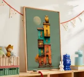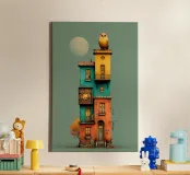 Un'opera d'arte stravagante e verticale di una stretta villetta a schiera dai colori vivaci, illuminata dolcemente dall'interno e coronata da un gufo gigante appollaiato sul tetto sotto la luna piena. I libri riempiono gli scaffali dei balconi, le zucche allineano i gradini e il caldo bagliore della sera porta mistero e fascino. Un'opera surreale e narrativa, perfetta per gli amanti della fantasia e dell'architettura.
