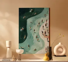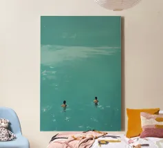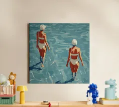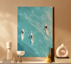 Scivolando fianco a fianco in un mare turchese, due nuotatori tracciano percorsi sincronizzati che si increspano verso l'esterno in archi delicati. Realizzato con audaci pennellate di olio, "Parallel Currents" cattura un tranquillo duetto di movimento e quiete, dove le figure umane e la distesa acquatica si fondono in un sereno balletto di colori e forme.