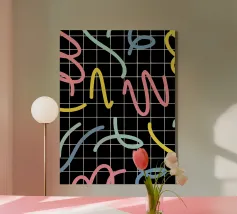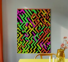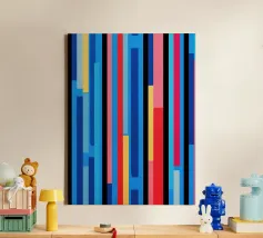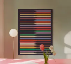Questa opera d'arte digitale a linee parallele colorate è un pezzo di grande impatto visivo che mette in mostra l'uso di linee precise. L'artista (kathrinmay) utilizza linee di diversa lunghezza per creare un senso di dimensionalità, mentre l'uso dei colori crea equilibrio.