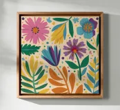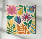 Una bella macchia di fiori selvatici stilizzati e stravaganti è illustrata in un affascinante stile ispirato all'arte popolare, con un delizioso mix di colori e forme che irradiano gioia e bellezza naturale.