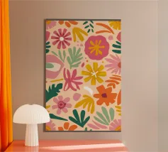 Una bella macchia di fiori selvatici stilizzati e stravaganti è illustrata in un affascinante stile ispirato all'arte popolare, con un delizioso mix di colori e forme che irradiano gioia e bellezza naturale.