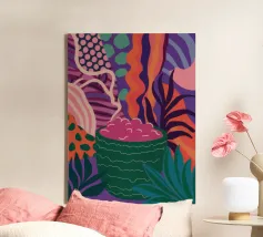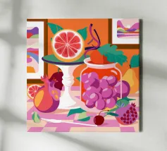 Una composizione astratta presenta una ciotola di fragole in mezzo a un turbinio di forme e motivi organici e colorati, creando un'interpretazione fresca e moderna di un classico dell'estate.