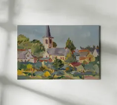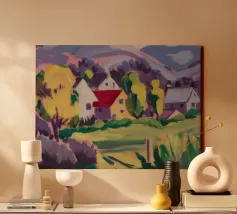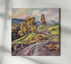 Un pittoresco paesaggio autunnale che raffigura un villaggio o una fattoria adagiata su una collina, circondata da un mosaico di alberi colorati nei toni dell'arancione e del giallo e da campi coltivati, con le lontane montagne blu a completare la scena.