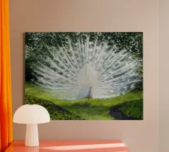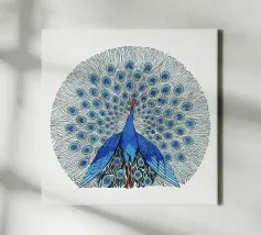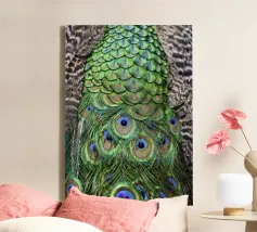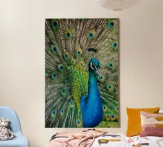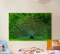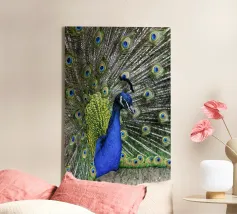 Una fotografia straordinaria che cattura un pavone in un'esibizione completa e ipnotica. I ricchi toni gioiello delle piume e l'imponenza della coda ne fanno un'opera d'arte di grande impatto.