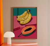 Un'illustrazione audace e ispirata alla pop art di banane e papaya su un piatto rosso brillante. I colori ad alto contrasto e lo stile grafico creano una dichiarazione vibrante e giocosa.