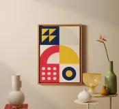 Un poster astratto audace e armonioso, che utilizza un design modulare e una tavolozza di blu navy, giallo brillante e rosso intenso. La composizione è divisa in quattro sezioni principali, ciascuna caratterizzata da elementi geometrici distinti: un quadrato scuro con quattro triangoli gialli, un grande semicerchio giallo, un blocco rosso con una griglia di nove cerchi bianchi e un motivo circolare a forma di occhio di bue. L'attenta disposizione dei blocchi di colore e delle forme semplici crea un'estetica dinamica ma equilibrata, fortemente influenzata dai movimenti Bauhaus e Mid-Century Modern. Questo download digitale ad alta risoluzione (7000x5000 pixel, 300 d