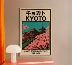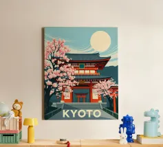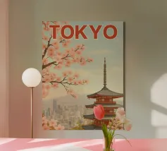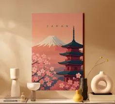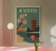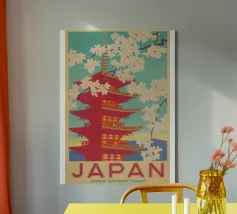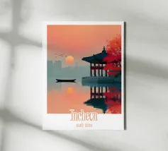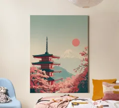 Ammirate un palazzo tradizionale di Seoul sotto gli alberi di ciliegio in fiore in questa illustrazione delicata e raffinata. Una scena intrisa di poesia coreana per valorizzare le vostre pareti.