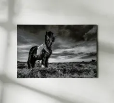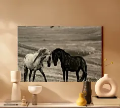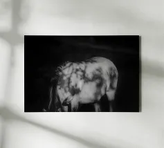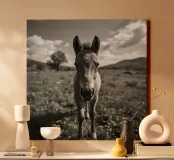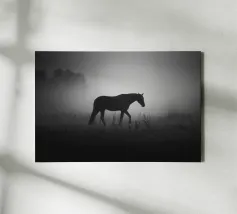 Puledro in piedi in un campo erboso in scala di grigi tela