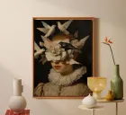"In this enigmatic portrait, a girl with a restless gaze and a frustrated expression gets lost among thick clouds that are part of an emotional storm. Each cloud seems to carry heavy thoughts and doubts about life's mistakes and stumbles. Her face, partially hidden by this haze, reflects that feeling of being trapped in the tough moments we all face."
