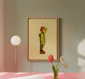 Un personaggio giocoso con la testa di cartone, che combina colori vivaci e linee decise. Quest'opera d'arte mescola umorismo e curiosità, invitando lo spettatore a interpretare la propria storia dietro la figura.
