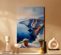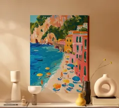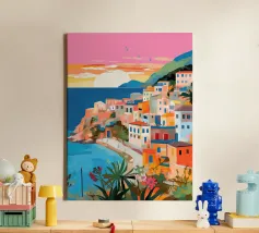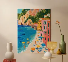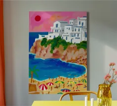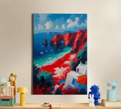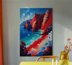 Quest'opera d'arte offre un'energica rappresentazione della Spiaggia Rossa di Santorini, con le sue imponenti scogliere rosse e il mare blu intenso. Le barche scivolano sulle acque calme, mentre i frequentatori della spiaggia si godono le coste assolate. Lo stile audace ed espressionista enfatizza il contrasto tra le rocce rosso fuoco e i toni sereni e freddi dell'acqua. Catturando sia la vivacità che la serenità di questa famosa destinazione, il dipinto dà vita all'essenza di una perfetta fuga nel Mediterraneo.